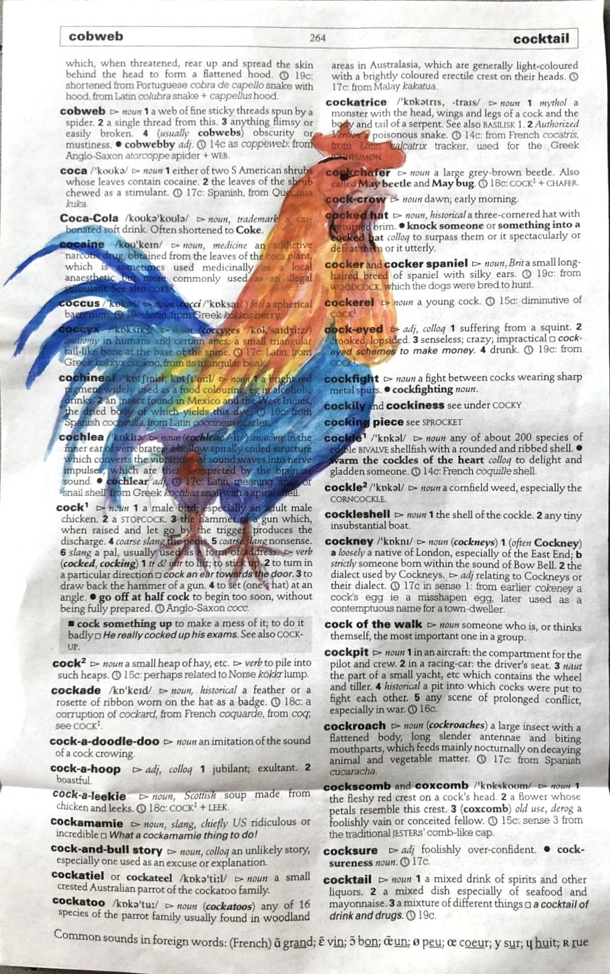 Brenda’s colourful picture of Frida Kahlo is in pastels as are her images of the dragon and the parrot on a dictionary page. The cockerel is painted in watercolours.
