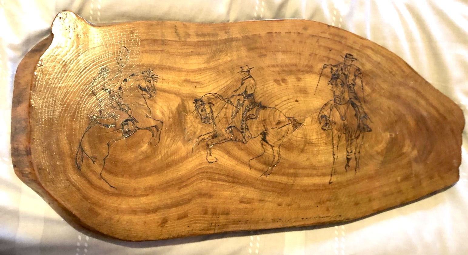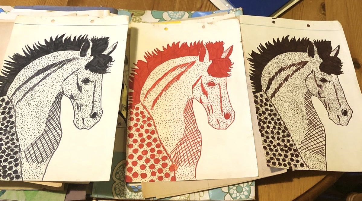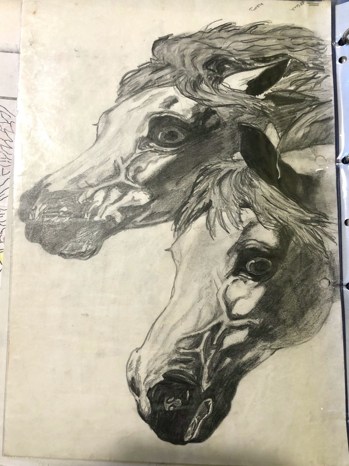 Kay was disappointed not to come to the session as she loves horses. At home she found her sketching book which she had begun at just 5 years old and continued with until her mid teens. The pyrography was done when she was 14 and the last image was painted a couple of years ago as a gift for a friend of her own horse.