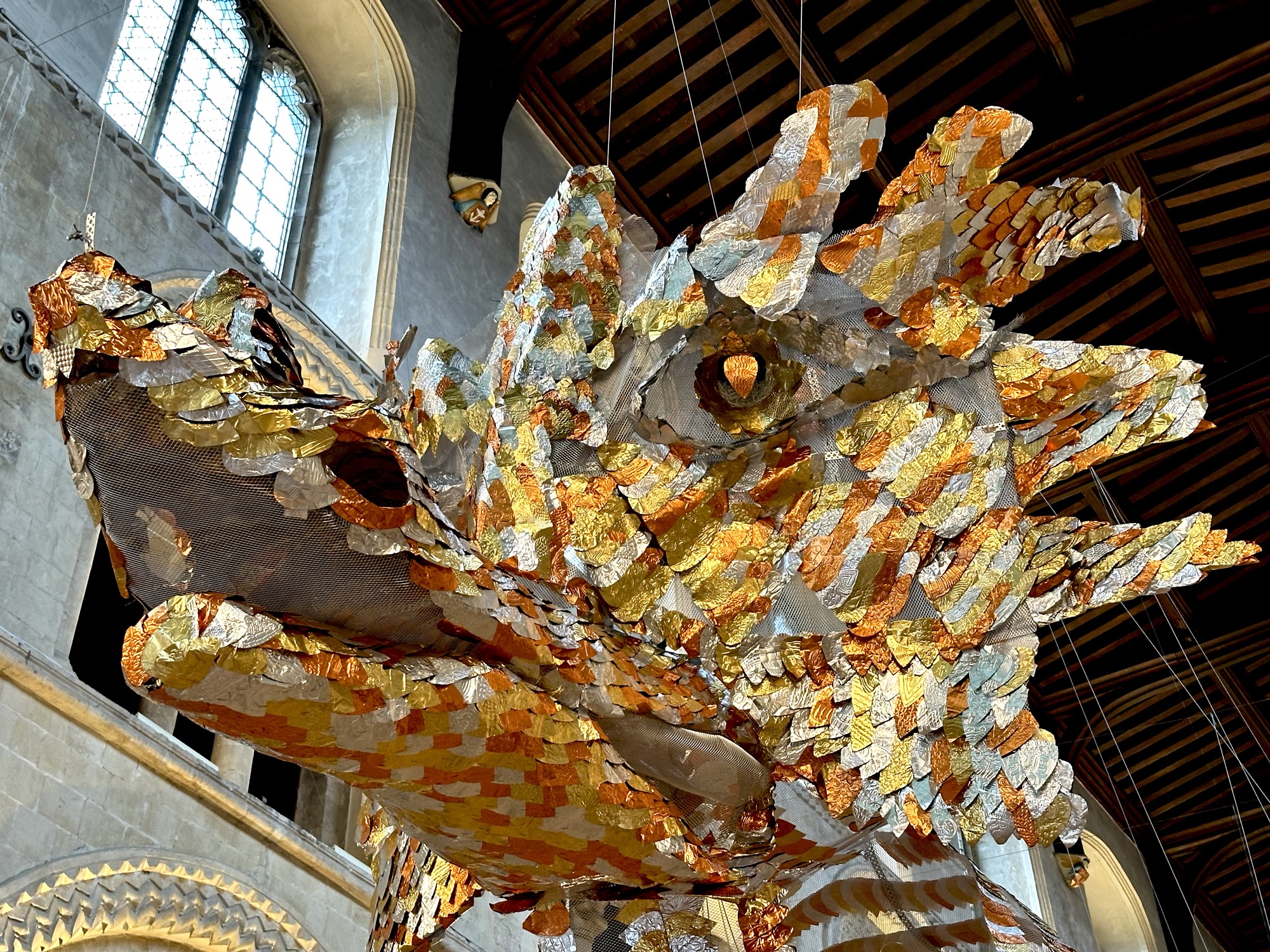 A few months ago some members embossed metal scales for a project at the cathedral. 12500 scales now adorn the Draco Roffensis dragon sculpture that is hanging above the nave. Here are photos of the sculpture and views in and around the cathedral.