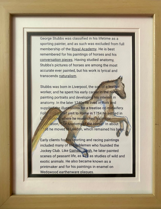 Janet W printed words about Stubbs on to Bockingford watercolour printer paper and painted a picture of Whistlejacket over the top in watercolour. She used the watercolours quite dryly so the words didn’t smudge. The painting is already framed as has just been exhibited in a Gravesend Art Group exhibition in the St.George’s Art Centre.