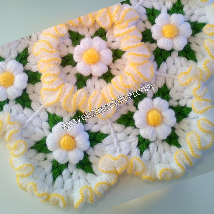 Yeni bir lif modeli papatya bahçesi. Renkler bir araya gelince ne yapsanız güzel görünüyor, benim için öyle. Sizlerde örmek isterseniz dilediğiniz renklerle …