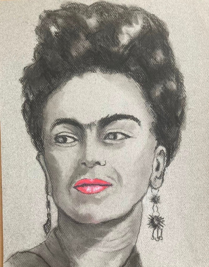 Steve’s posterised image of Frida Kahlo was painted in acrylics and the other in black pastel on grey pastel paper with a dramatic pop of lip colour in pink. Chalk Church was created when we visited last month, again in pastel but using many colours for a realistic picture.