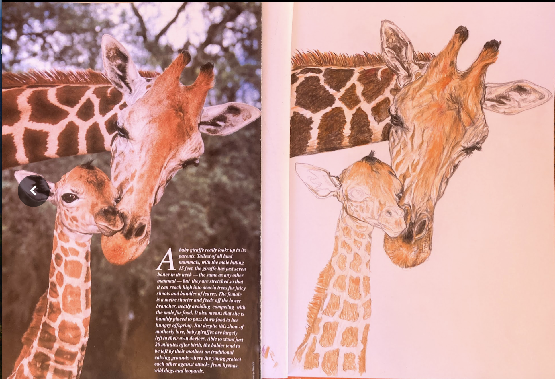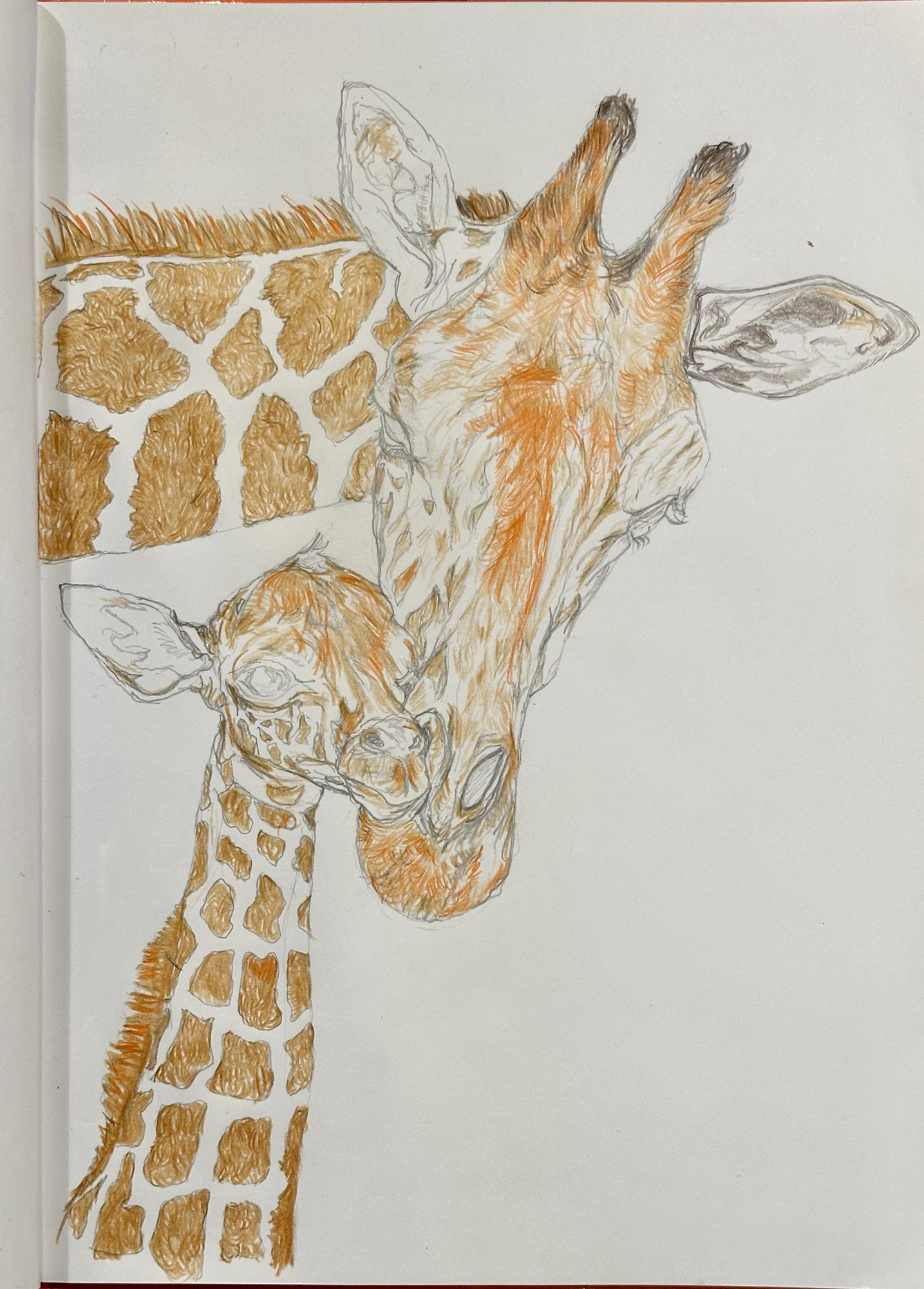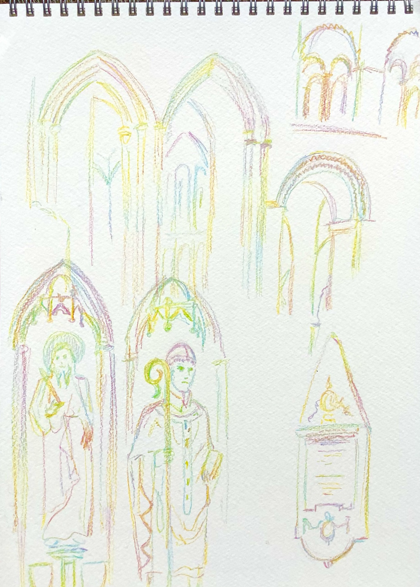 We couldn’t use any paint or water inside the cathedral so everyone sketched using dry mediums of pencils, coloured pencils, charcoal and pens. Most members drew the architecture and views around them but as usual we don’t mind at all if you come along to a session and ‘do your own thing’, so a giraffe and highland cow join the gallery. We start off with the girls’ pictures, including a super picture of Grandad Ron…