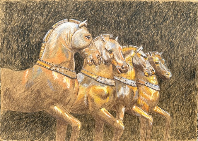 Tracy chose the Triumphal Quadriga as her subject, otherwise known as the Horses of Saint Mark, in St.Mark’s Basilica in Venice. Believed to have been sculpted in the 2nd or 3rd century CE in Rome or possibly the 5th or 4th century BCE in Greece, they were displayed for centuries at the Hippodrome of Constantinople until the sack and looting of the city by Venetian forces in 1204 during the Fourth Crusade. The four horses were then mounted above the entrance of the basilica in Venice until they were looted by Napoleon in 1797 and taken to Paris, but were returned to Venice in 1815. Copies of the four horses are now outside St. Mark’s Basilica whilst the originals are displayed inside under spotlights which highlight the original mercury gilding that remains.