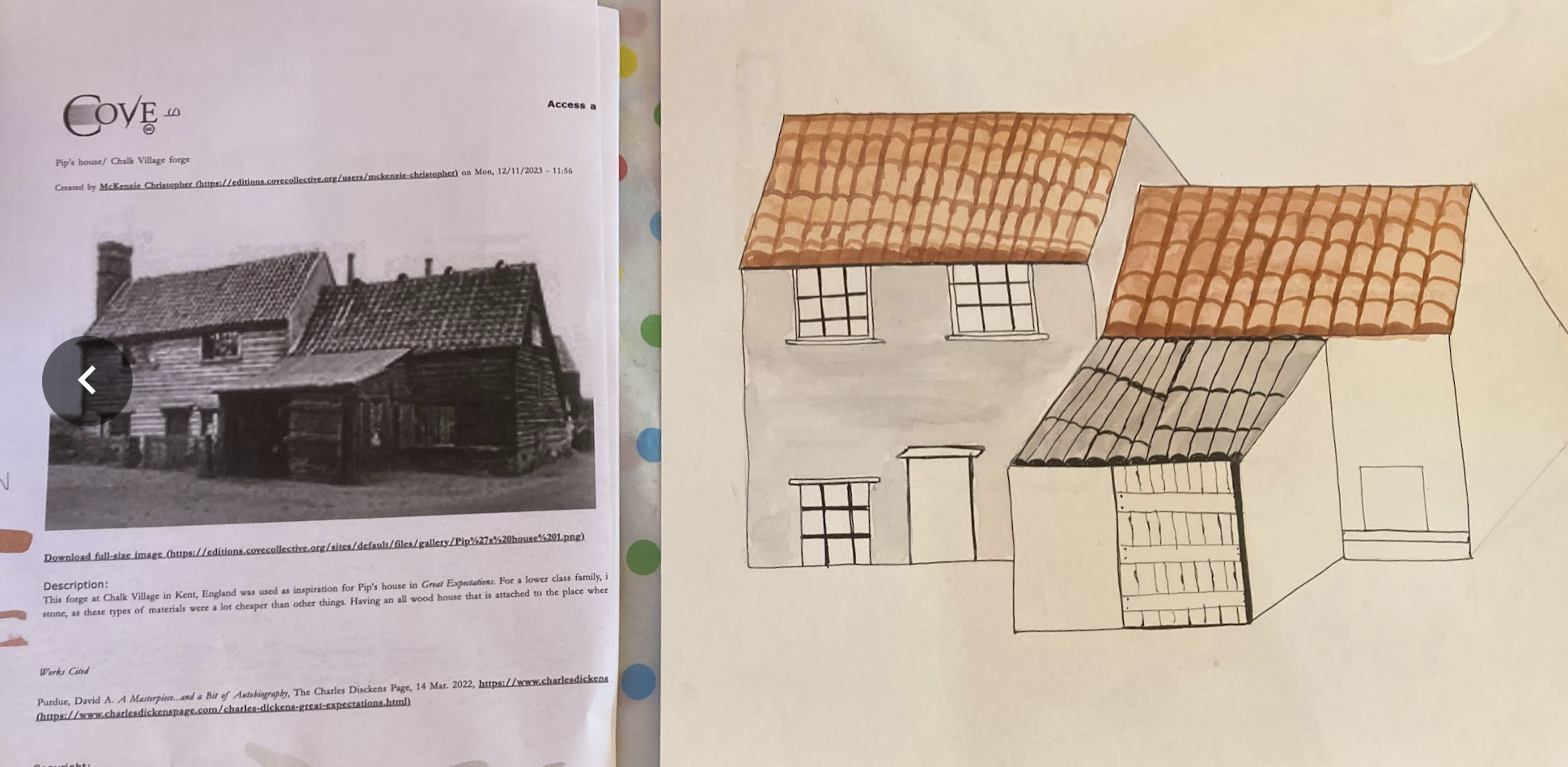 A good start was made with the pictures and hopefully they’ll be finished at home. Patrick finished his pencil drawing inspired by an old postcard.