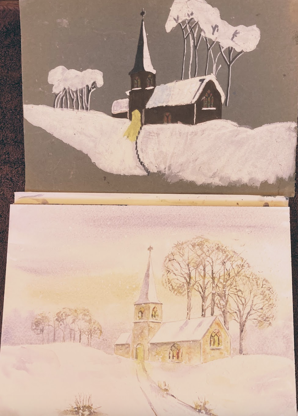 Here are several pictures that were finished at home from sessions on Frida Kahlo, painting on a book page, Underwater Life, In an English Country Garden, and Chalk Church.